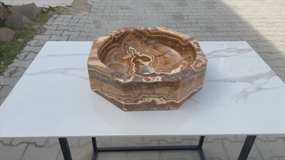 The combination of a smooth, polished interior and exterior ensures this vessel sink will be the focal point of your home decor. The breathtaking onyx from Turkey will blend into any setting. These octagon vessel sinks for bathrooms are not only convenient for everyday use, but also an ornament for your living space. The artisanal construction ensures that no two sinks will be exactly identical.